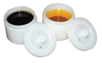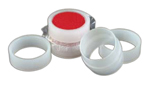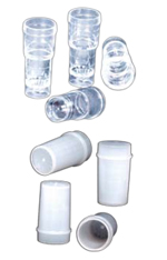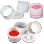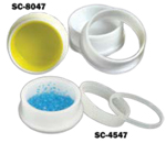Sample prep tools effectively assist in sample cup assembly. Made of high density polyethylene, they are used to push the ring downward onto the cup for a snap fit seal. The hole in the middle of the tool allows air to escape, which prevents the film from sagging.