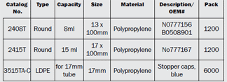 • Sample tubes suitable for diluters, ICP-MS, ICP-OES, FIA, Ion Chromotography (IC) and Mercury Analyzer Autosampler