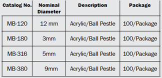 Our methyl methacrylate ball pestles are completely transparent and versatile. They show great resistance to breakage and can withstand high temperatures between 140-200ºF, which make them ideal for light impact grinding and mixing with polystyrene vials.
