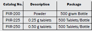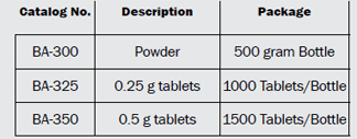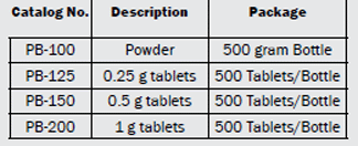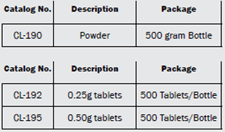 • Available in powder form as well as in 0.25g and 0.5g tablets.
